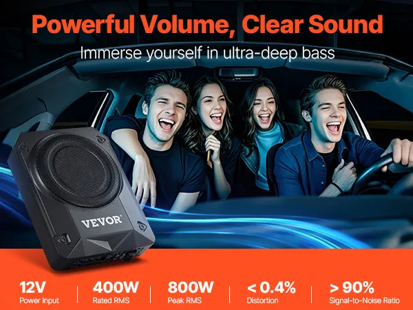 Stable with High Fidelity: With 400W RMS rated power and 800W RMS peak power, our 8" powered car audio subwoofer delivers a distortion rate below 0.4% and a signal-to-noise ratio greater than 90%. It maintains clear, accurate sound even at high volumes, minimizes background noise, and prevents speaker damage, creating an immersive audio experience.
