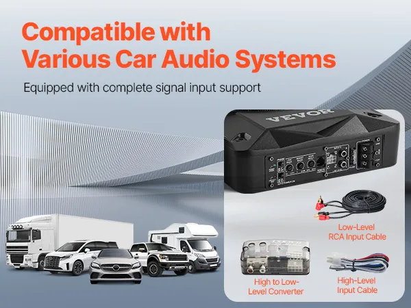Compatible with all vehicle types—cars, SUVs, trucks, and RVs—this subwoofer seamlessly integrates with your audio system using the RCA audio cable or high-level input cable, offering impeccable matches with both high-end and simplified main units.