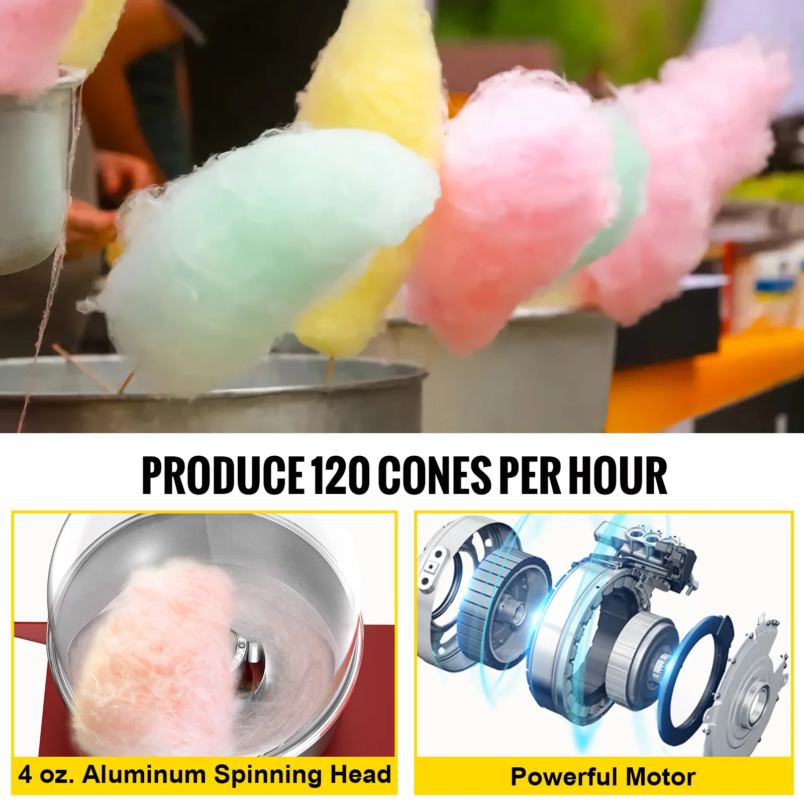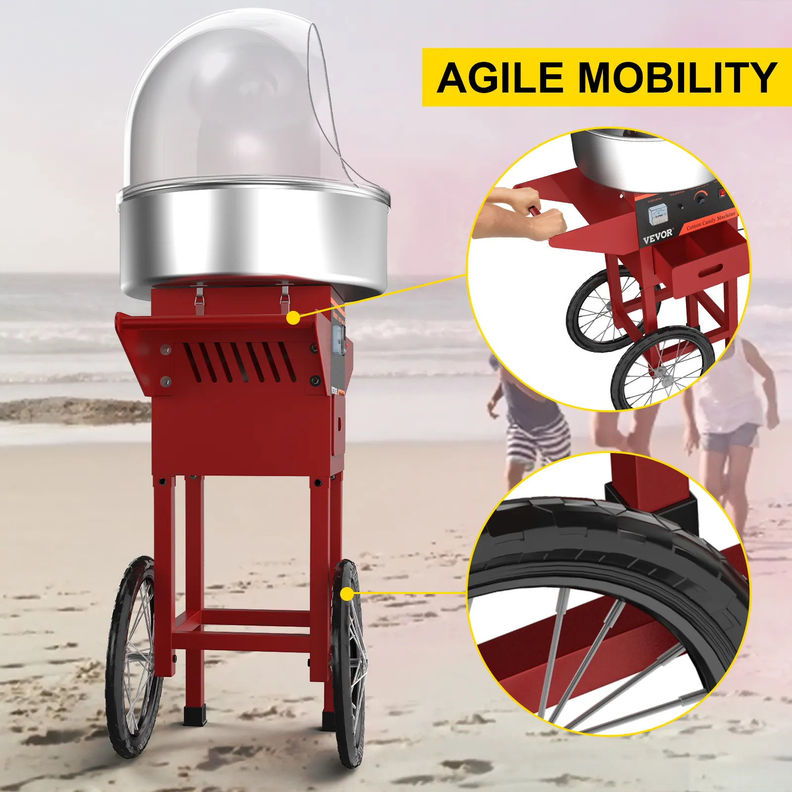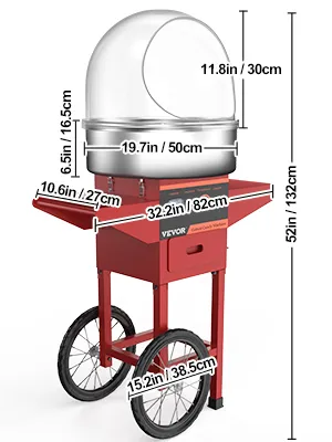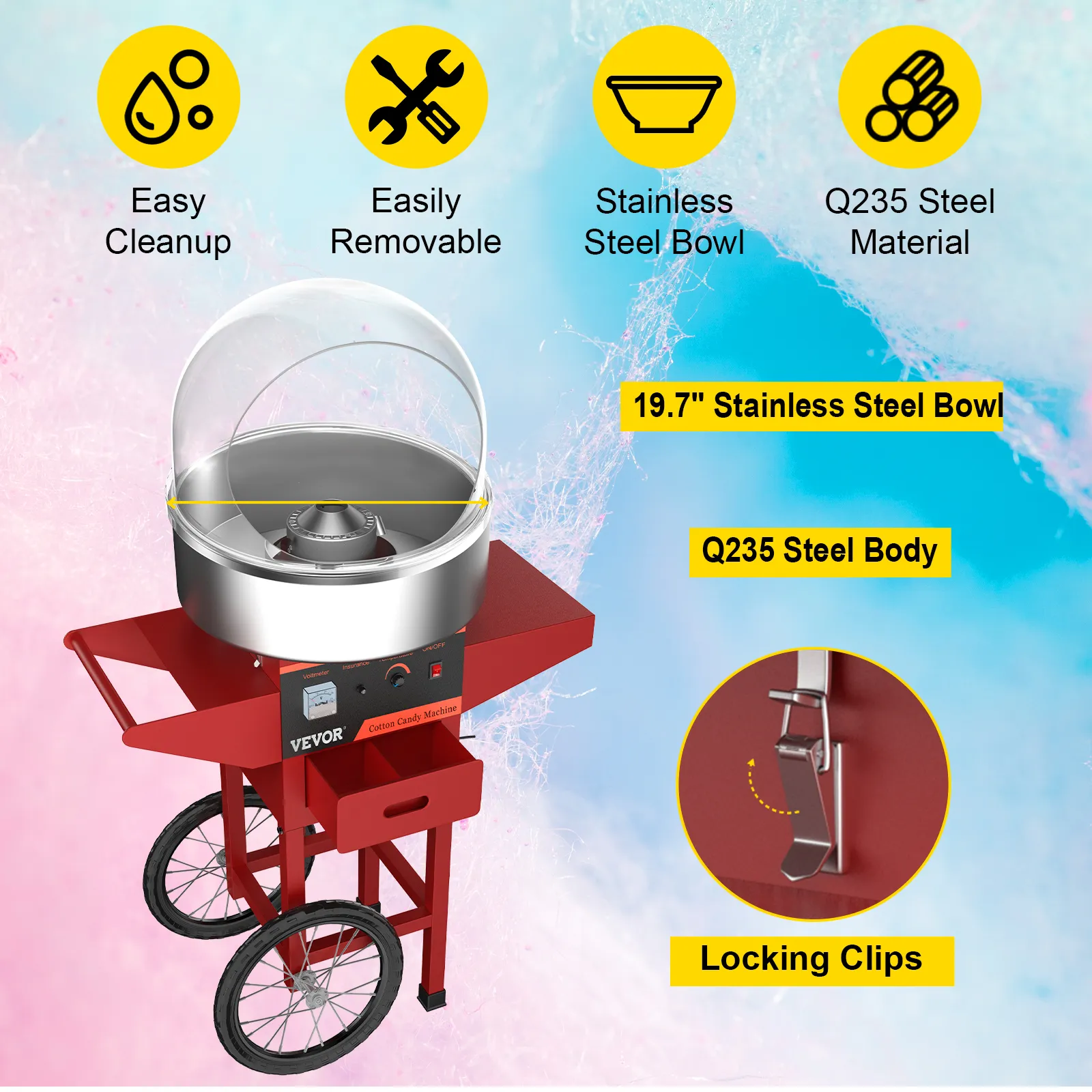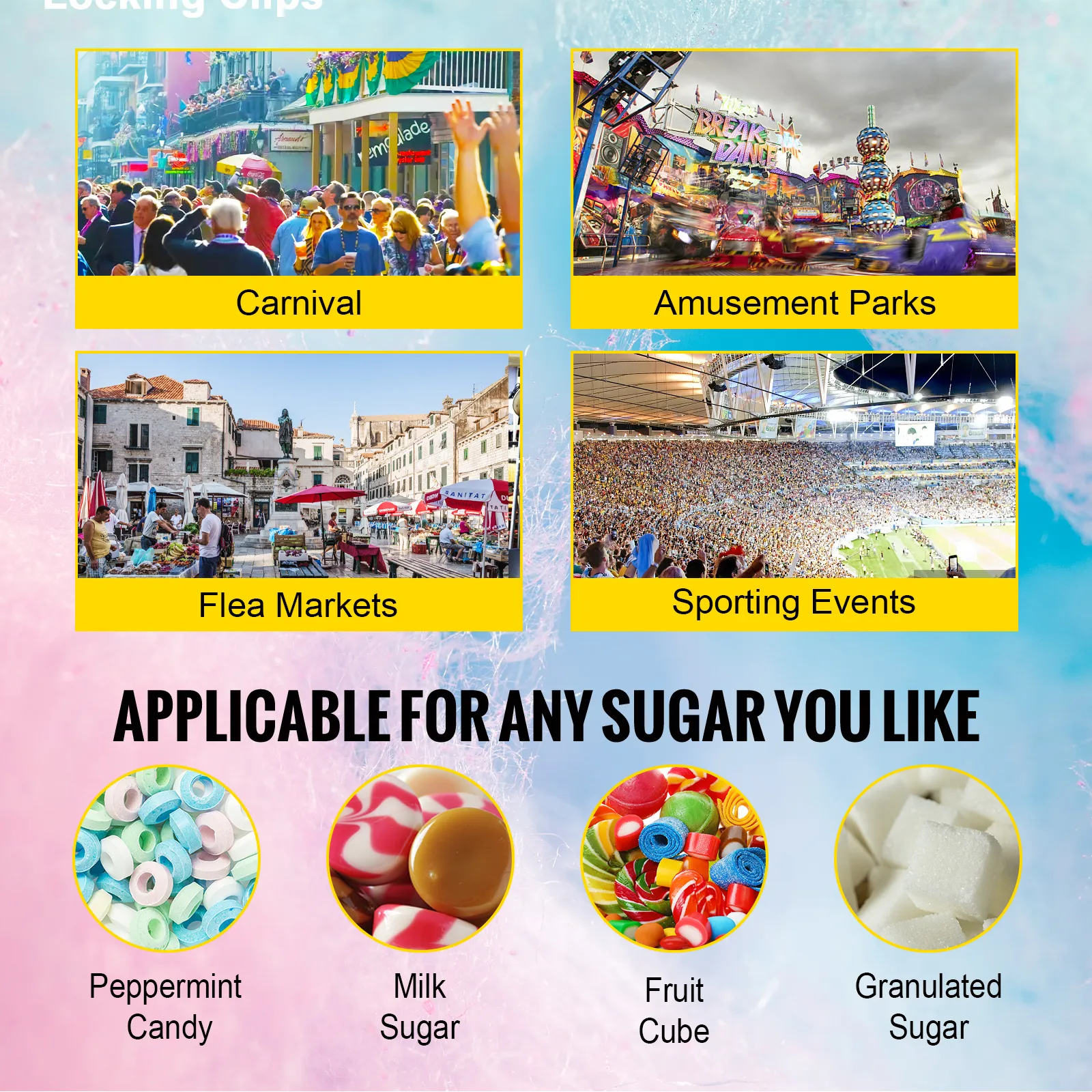 Met suiker als grondstof kan deze suikerspinmachine kleurrijke suikerspin met verschillende smaken produceren. Hiermee is suikerspin niet langer alleen maar wit, maar rood, geel, blauw, groen, paars en andere kleuren, milieuvriendelijk en lekker. Ideaal voor verjaardagsfeestjes, diploma-uitreikingen, festivals, carnaval en beurzen. De kar en wielen zorgen voor gemakkelijke verplaatsing.