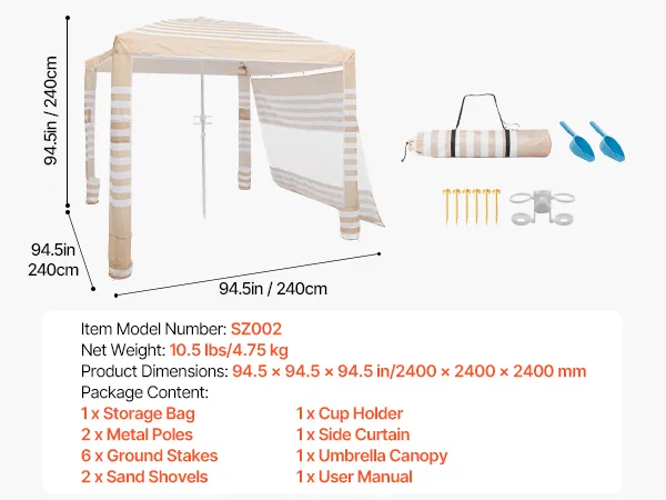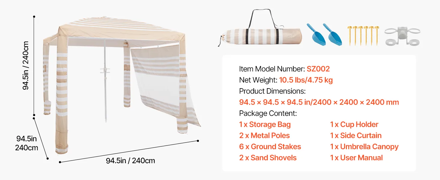 Strandtent van 2,4 x 2,4 m: Deze ruime strandcabana met zijgordijnen biedt comfortabel plaats aan vier tot vijf personen, plus stoelen en bagage. Bekerhouders en opbergvakken zorgen ervoor dat drankjes, mobiele telefoons, zonnebrillen en zonnebrandcrème binnen handbereik zijn.