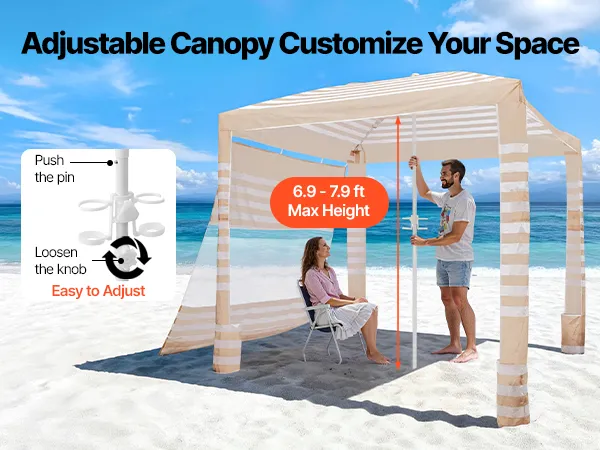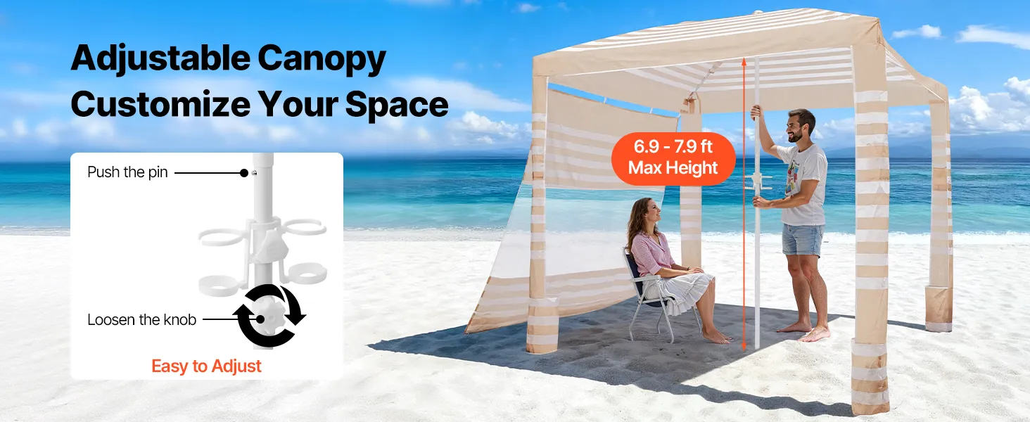 In hoogte verstelbaar: De grote strandtent is voorzien van een verbeterde, verstelbare verbindingsstang waarmee de hoogte kan worden aangepast van 2,1 tot 2,4 meter. Dit zorgt voor meer hoofdruimte, zodat u comfortabel kunt staan zonder te hoeven bukken en kunt genieten van een breder gezichtsveld.