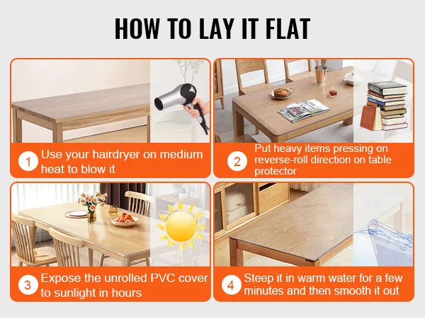 Gemakkelijk te gebruiken: Volg deze eenvoudige stappen om het meeste uit de voordelen van de plastic tafelmat te halen: Open de verpakking. Open de verpakking en veeg stof en vuil af met een vochtige doek. B. Gebruik een föhn met middelmatige hitte op een afstand van ongeveer 10 cm van het matoppervlak om de mat effectief recht te trekken. C. Zorg voor een vochtig werkoppervlak en leg de mat plat. Gebruik plasticfolie om eventuele luchtbellen te verwijderen, zodat een comfortabele en mooie pasvorm ontstaat.