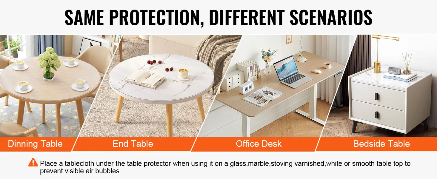 MULTIFUNCTIONEEL - Onze transparante tafelbeschermers kunnen een verscheidenheid aan omgevingen verbeteren, waaronder huizen, kantoren, restaurants en locaties. Ze zijn geschikt voor tafels met een houten structuur, zoals eettafels, keukenbladen, bijzettafels, computertafels, dressoirs, tv-kasten en nog veel meer. Ontdek de onbeperkte mogelijkheden en verbeter uw levenskwaliteit!
