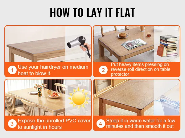 Easy to Use: Follow these simple steps to maximize the benefits of the plastic table cover: a. Open the package and wipe away any dust or debris with a damp cloth. b. Use a hair dryer on medium heat, held about 10 cm away from the mat's surface, to flatten it effectively. c. Ensure a wet desktop surface, then lay the mat flat. Use a plastic sheet to remove any air bubbles and achieve a snug and beautiful fit.