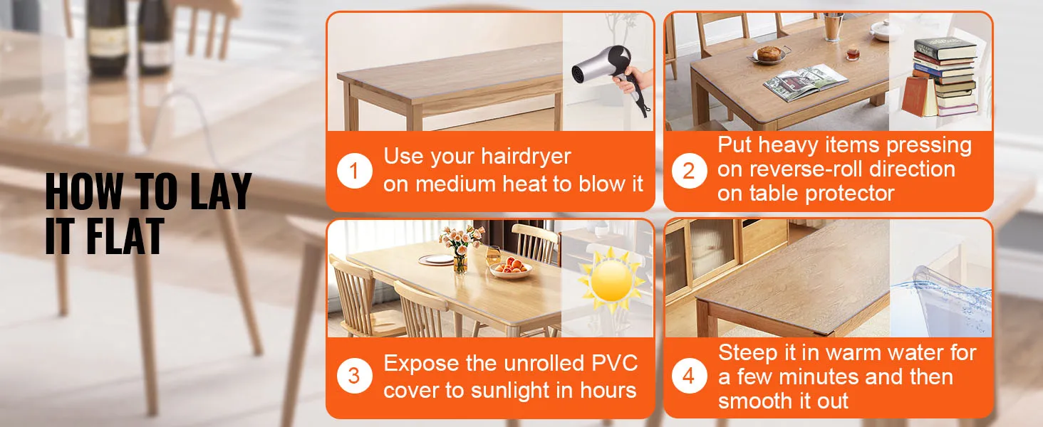 Gemakkelijk te gebruiken: Volg deze eenvoudige stappen om het meeste uit de voordelen van de plastic tafelmat te halen: Open de verpakking. Open de verpakking en veeg stof en vuil af met een vochtige doek. B. Gebruik een föhn met middelmatige hitte op een afstand van ongeveer 10 cm van het matoppervlak om de mat effectief recht te trekken. C. Zorg voor een vochtig werkoppervlak en leg de mat plat. Gebruik plasticfolie om eventuele luchtbellen te verwijderen, zodat een comfortabele en mooie pasvorm ontstaat.