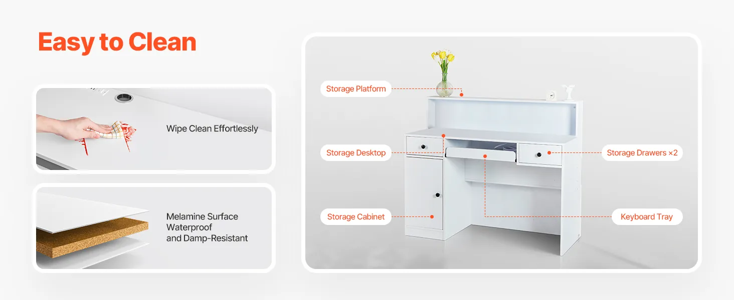 Sturdy & Reliable Construction: This reception desk is made from high-density fiberboard (MDF) with a smooth, wear-resistant, and waterproof surface, making it ideal for long-term use and easy maintenance. The desktop and frame are structurally stable with a strong weight-bearing capacity, ensuring durability and longevity.