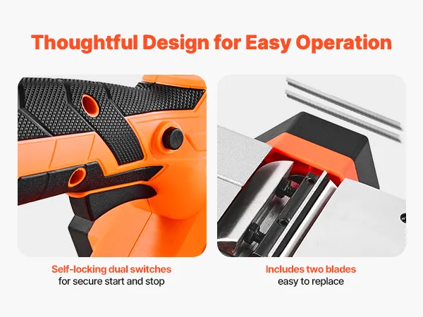Deze elektrische schaafmachine is voorzien van twee zelfvergrendelende schakelaars voor veilig starten en stoppen. Hij wordt geleverd met twee messen die eenvoudig te vervangen zijn, wat het proces sneller en gemakkelijker maakt.