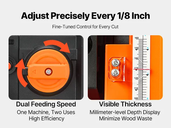 Twee snelheden, eenvoudige diepteregeling: met deze schaafmachine kunt u kiezen uit twee invoersnelheden voor hoge efficiëntie en precisie. Stel de snijdiepte in met precieze stappen van 1/8 inch en tot op de millimeter nauwkeurig voor herhaalbare resultaten.