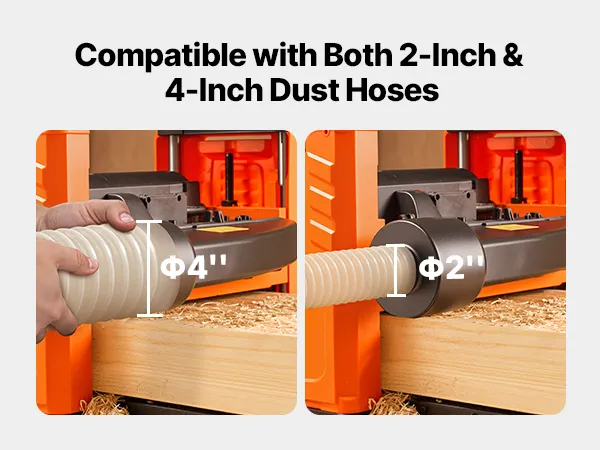 Geschikt voor stofslangen van 48,2 mm en 99 mm: de schaafmachine is geschikt voor stofslangen van 48,2 mm en 99 mm en voert houtsnippers efficiënt af, waardoor uw werkruimte schoon blijft en er zo min mogelijk stof in de lucht terechtkomt. Zo creëert u een prettige werkomgeving.