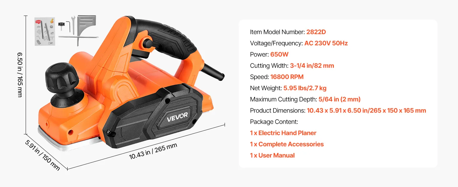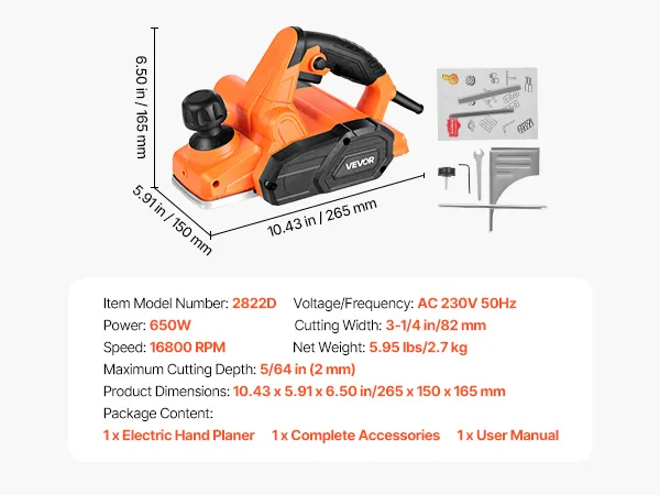 Efficiënt en nauwkeurig zagen: Aangedreven door een krachtige motor biedt deze elektrische schaafmachine een maximale snijbreedte van 82 mm en een snijdiepte van 2 mm. Hiermee kunt u snel en nauwkeurig door hout zagen, wat u tijd en moeite bespaart.