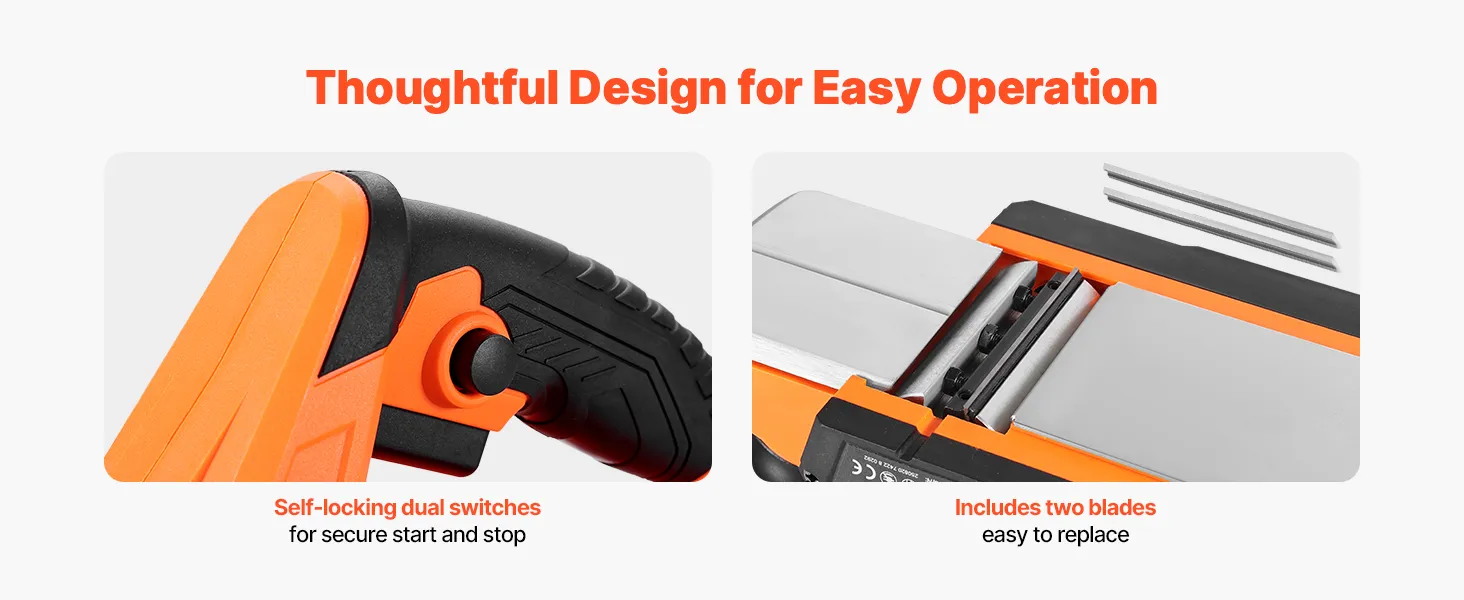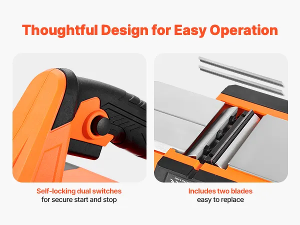 Deze elektrische houtbewerkingsmachine is voorzien van twee zelfvergrendelende schakelaars voor veilig starten en stoppen. Er worden ook twee messen meegeleverd voor eenvoudige vervanging, wat het proces sneller en gemakkelijker maakt.