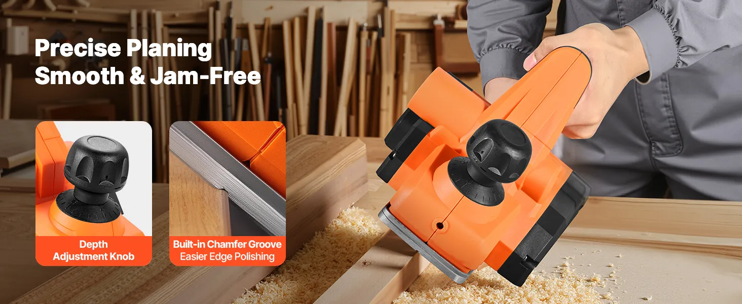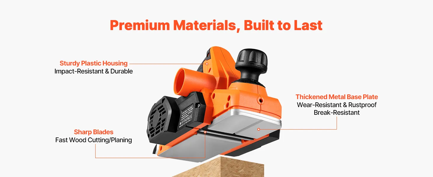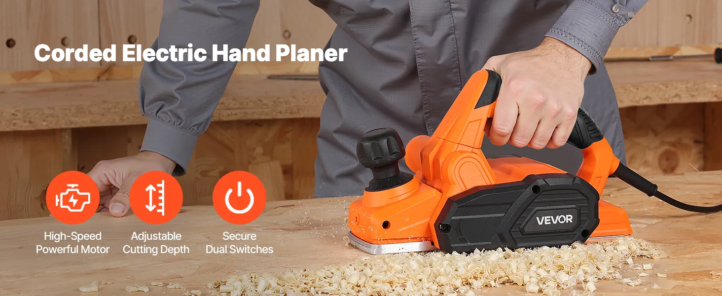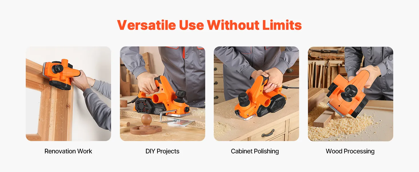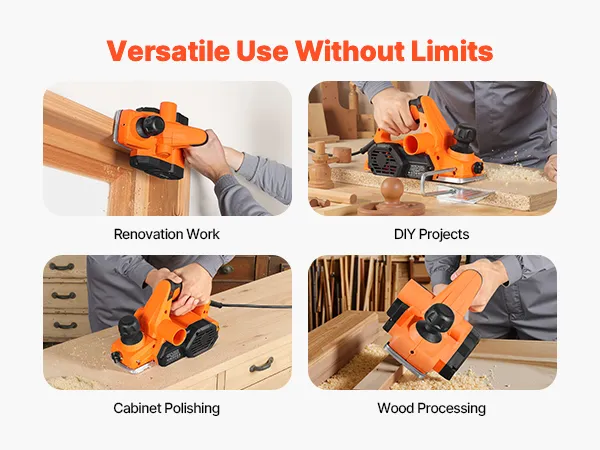 Veiligheidsvoorzieningen: De elektrische schaafmachine heeft een ontwerp met dubbele schakelaar om onbedoeld starten te voorkomen en extra veiligheid te bieden tijdens het werken. Dit vermindert operationele risico's, zodat u zich met een gerust hart kunt concentreren op uw houtbewerkingsprojecten.