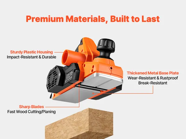 With a powerful motor, our corded electric handheld planer delivers strong performance. The sturdy plastic housing is impact-resistant, while the reinforced metal base plate withstands wear and rust. Sharp blades provide fast cutting and smooth planing, extending service life.