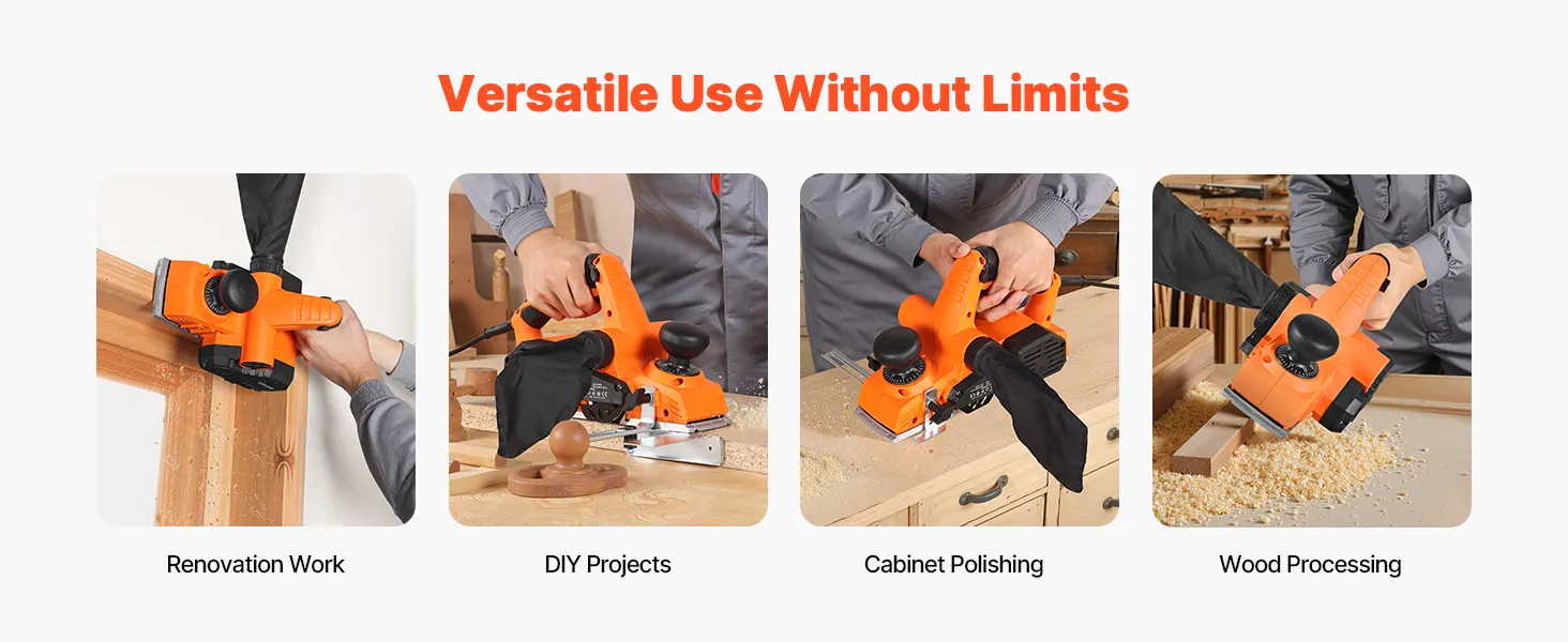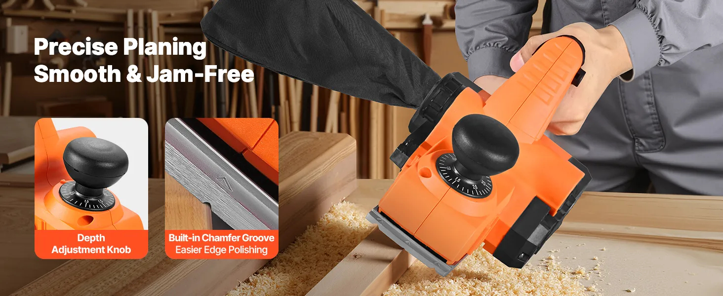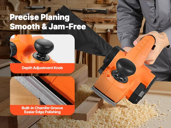 Deze elektrische schaafmachine is uitgerust met een instelbare diepteknop voor eenvoudige schaafdiepte-instelling. De geïntegreerde afschuingroef vergemakkelijkt het polijsten van de randen en zorgt voor soepel schaven zonder vastlopen, wat de werkefficiëntie en -kwaliteit verbetert.