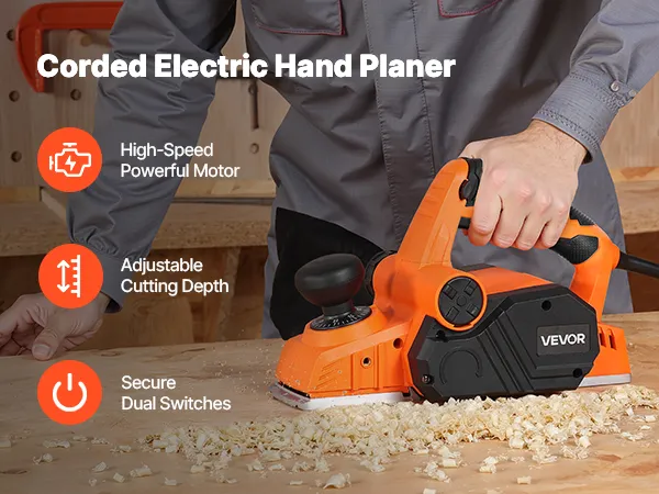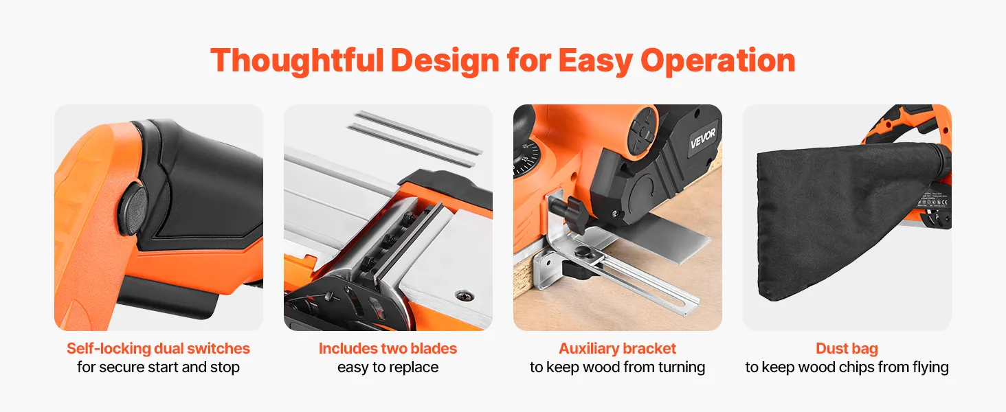 Deze elektrische schaafmachine is voorzien van twee zelfvergrendelende schakelaars voor veilig starten en stoppen. Hij wordt geleverd met twee messen die eenvoudig te vervangen zijn, wat het proces sneller en gemakkelijker maakt.