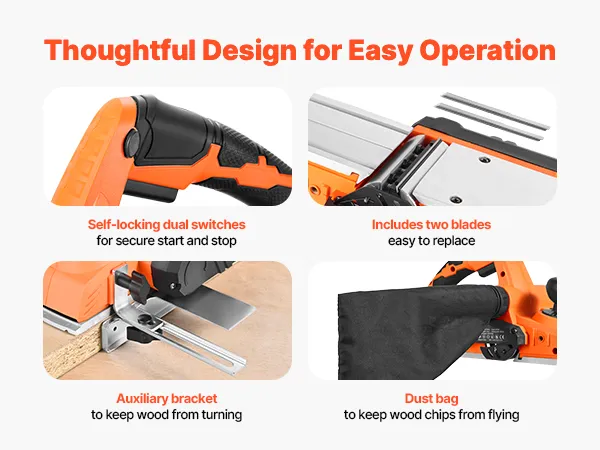 Meerdere veiligheidsvoorzieningen: De elektrische schaafmachine heeft een ontwerp met dubbele schakelaar om onbedoeld starten te voorkomen en extra veiligheid te bieden tijdens het werken. De onderste beschermkap beschermt de messen tegen beschadiging, terwijl de parallelgeleider zorgt voor nauwkeurige sneden.
