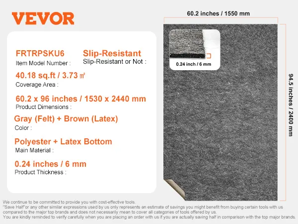 VEVOR Tapijttegels, 153x244cm, Tapijtmatten, Beschermende Rubberen Onderlaag voor Tapijten, 0,6cm Dik - Antislip Viltmat met Dubbel Oppervlak, Vloerbedekking, Veilig voor Alle Vloeren, Grijs