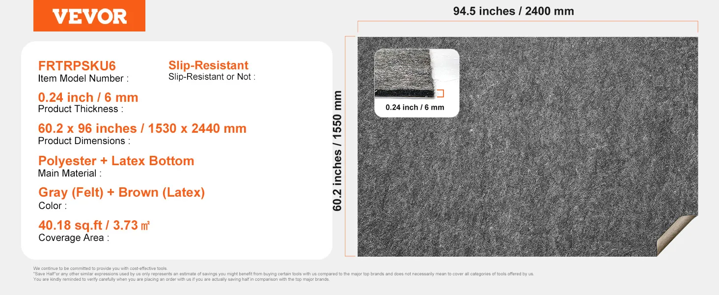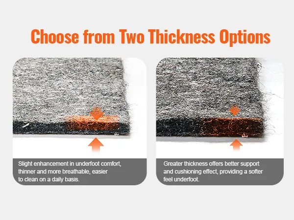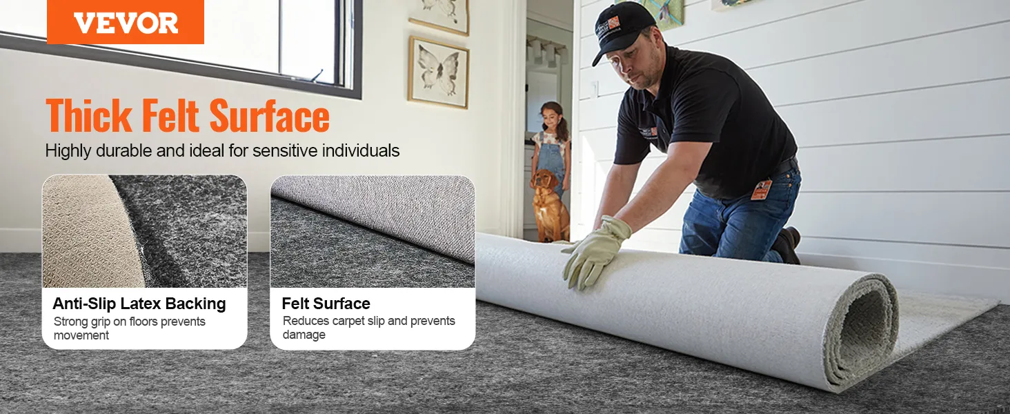 Tweekleurige antislipcoating: de onderkant is bedekt met antisliplatex voor een sterke grip om het tapijt op zijn plaats te houden. Het dichte viltoppervlak beschermt uw tapijt effectief en voorkomt uitglijden, waardoor een veilige en stabiele ervaring wordt gegarandeerd.