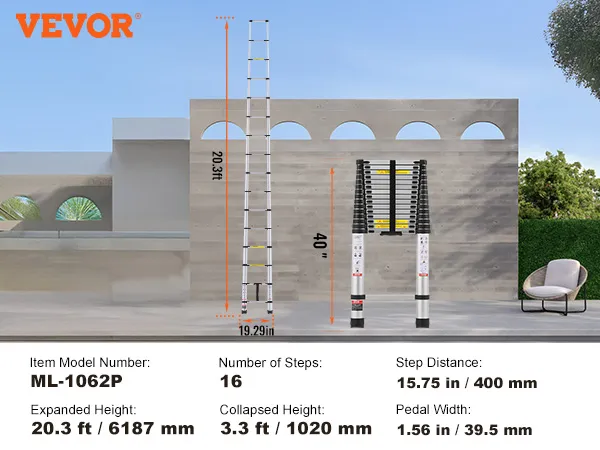 Veelzijdig ontwerp: de telescopische ladder kan handmatig in hoogte worden aangepast, kan volledig worden uitgeschoven tot 20,3 voet / 6187 mm en wordt ingetrokken tot een compacte hoogte van 3,3 voet / 1020 mm. Dit maakt hem perfect voor een verscheidenheid aan taken, van binnenprojecten tot buitenonderhoud, terwijl hij gemakkelijk op te bergen en te vervoeren is.