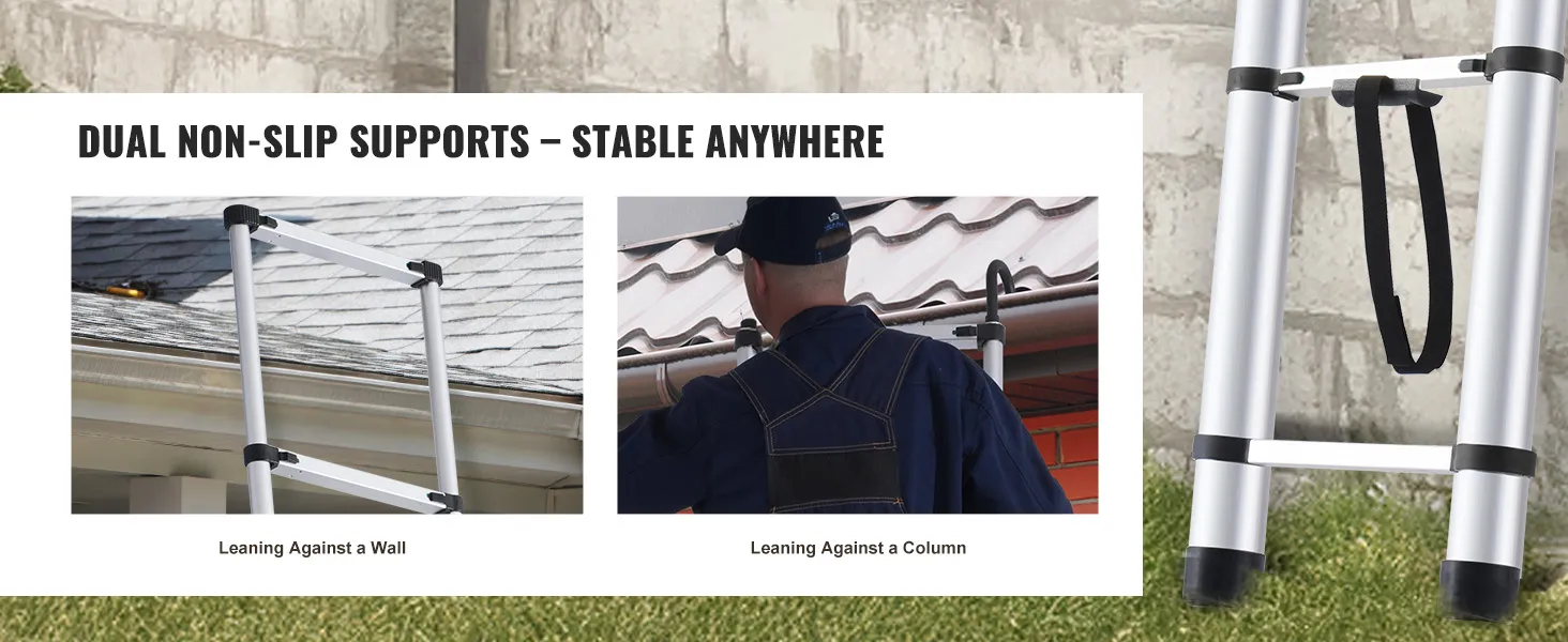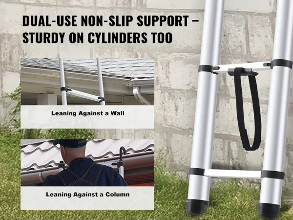 De bovenkant van de telescopische ladder is voorzien van dubbele antislipsteunen die zorgen voor stabiliteit op zowel cilindrische oppervlakken als muren zonder dat de ladder omvalt.