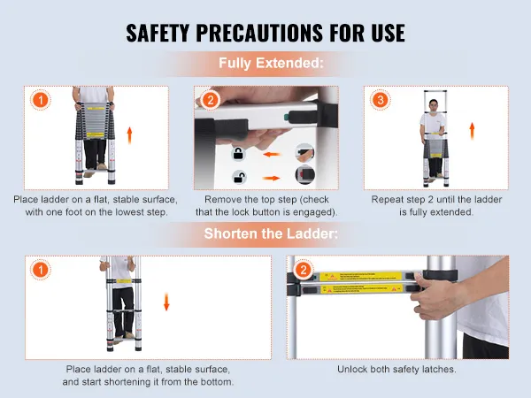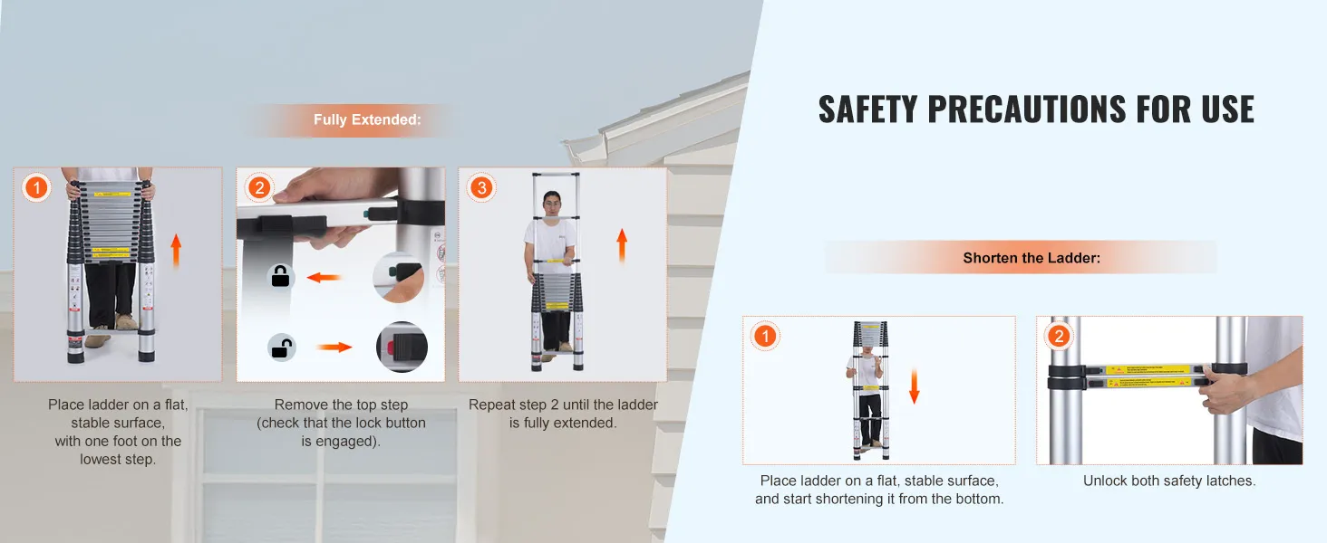 De ladder kan volledig worden uitgeschoven of aangepast aan individuele niveaus. Verschillende uittrekvormen vereisen verschillende bedieningsmethoden. Zorg er daarom voor dat de knoppen tijdens gebruik vergrendeld zijn om ongelukken te voorkomen.