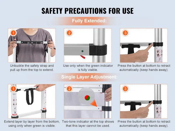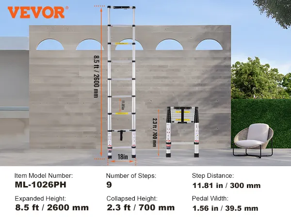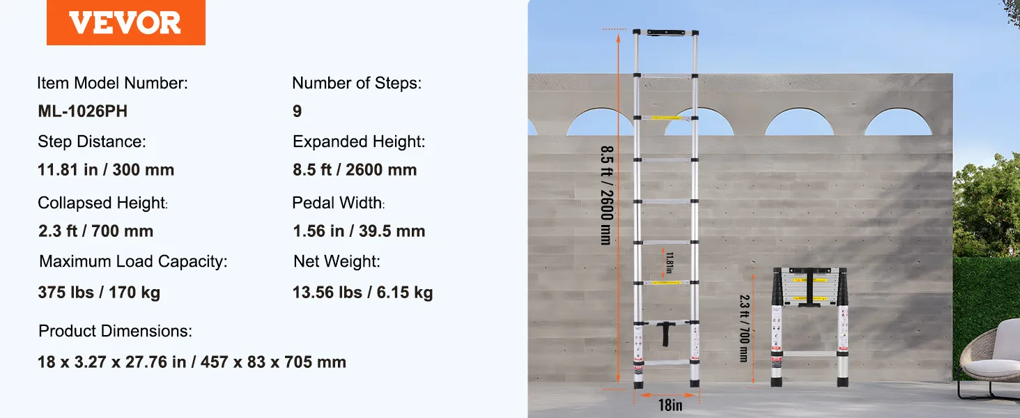 Veelzijdig ontwerp: de hoogte van de vouwladder kan handmatig worden aangepast. Hij kan volledig worden uitgeschoven tot 2,6 m en kan worden ingetrokken tot een compacte hoogte van 70 cm. Dit maakt hem perfect voor een verscheidenheid aan taken, van binnenprojecten tot buitenonderhoud, terwijl hij gemakkelijk op te bergen en te vervoeren is.