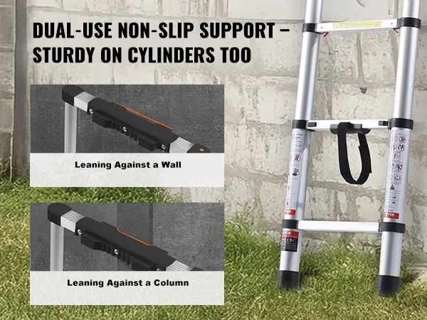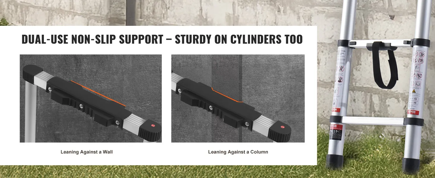 De bovenkant van de telescopische ladder is voorzien van dubbele antislipsteunen die zorgen voor stabiliteit op zowel cilindrische oppervlakken als muren zonder dat de ladder omvalt.
