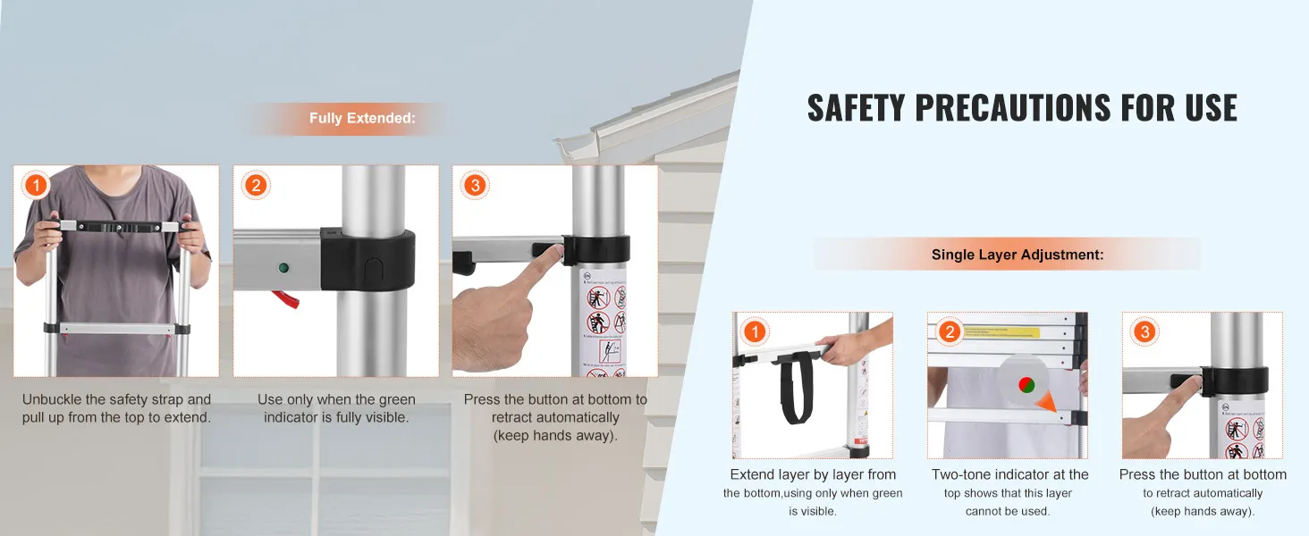 Gemakkelijk mee te nemen: deze telescopische ladder is gemaakt van een aluminiumlegering, licht en draagbaar, waardoor hij gemakkelijk te dragen is, zelfs wanneer deze volledig is uitgeschoven. Hij kan gemakkelijk thuis of in de garage worden opgeborgen en helpt uw woonruimte netjes en georganiseerd te houden.