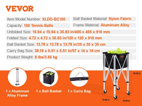 VEVOR Opvouwbare tennisballencontainer, geschikt voor 150 tennisballen, lichtgewicht tennisballenmand van aluminiumlegering met wielen, afneembare tas, draagtas, draagbare sportleswagen voor tennissers