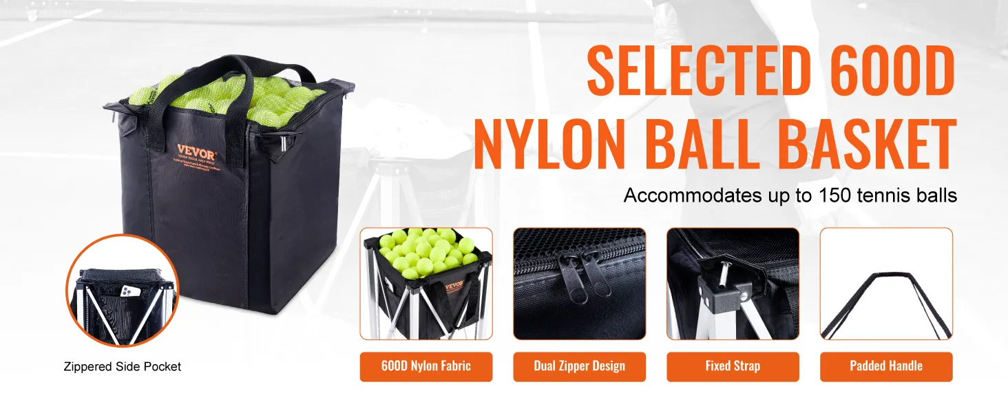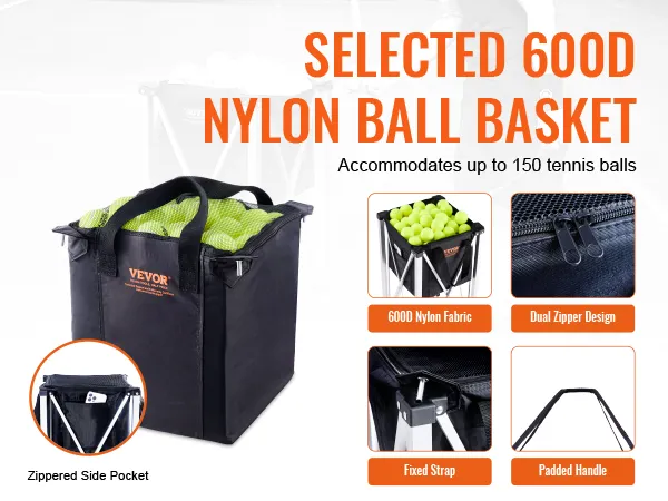 De tennisballenhopper biedt plaats aan maximaal 150 tennisballen dankzij de stevige constructie van 600D verdikt nylon. Maak je geen zorgen over morsen of overlopen!