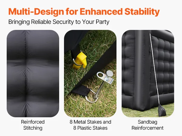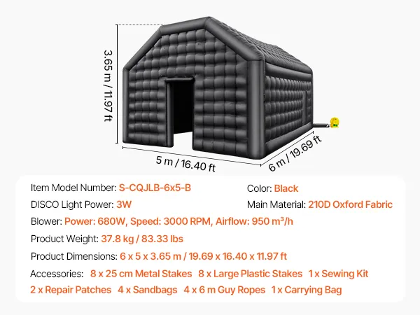 • Durable Construction: Made from high-quality 210D Oxford fabric, this inflatable party tent is waterproof, windproof, and designed for durability, complete with ground stakes, guy ropes, and sandbags for stability.