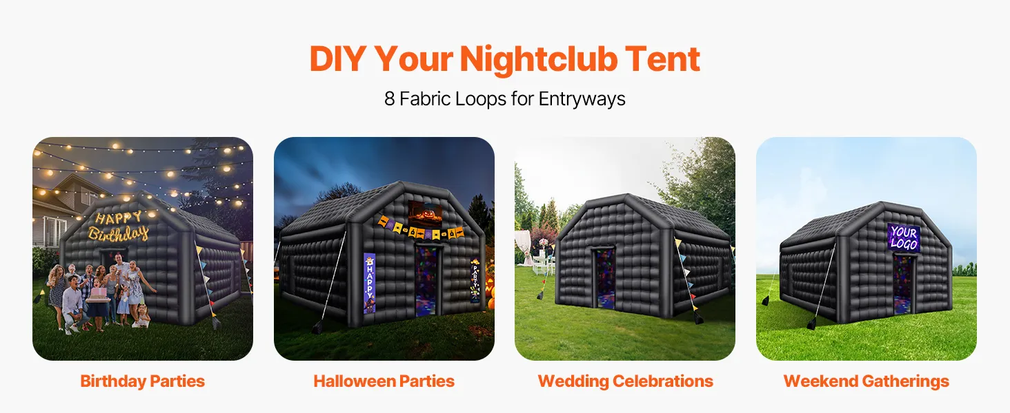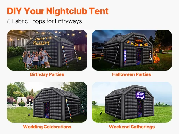 This 323 sq ft inflatable nightclub tent offers ample space for lively events, making parties more exciting. Ideal for weddings, gatherings, birthdays, and Halloween celebrations. With quick setup, a DISCO lighting system, multiple stability features, it's a reliable partner for any occasion.
