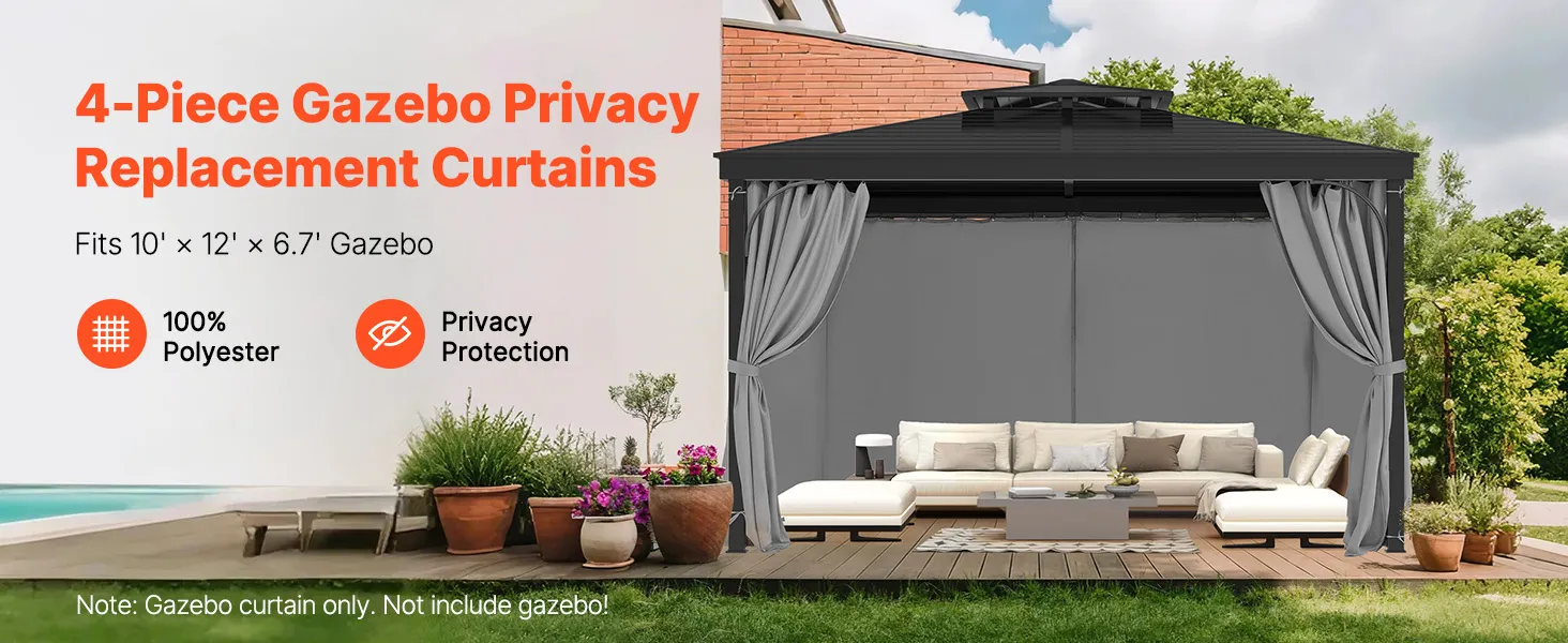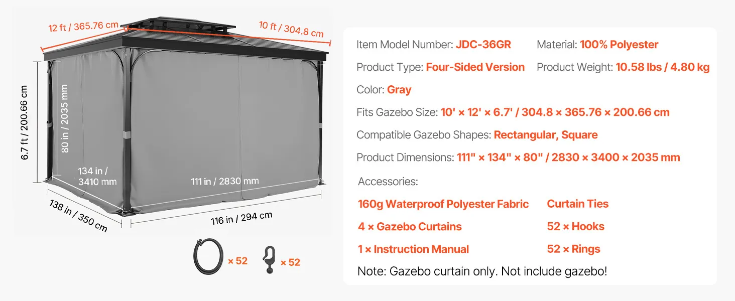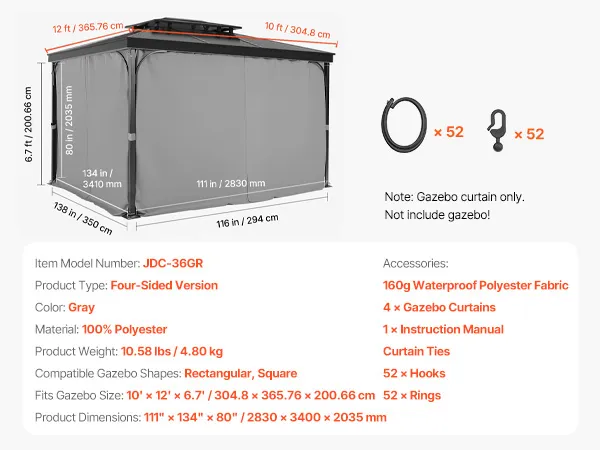 Compatible Size: This 111" x 134" x 80" gazebo privacy replacement curtain is compatible with gazebo with post-to-post spacing of 138 (L) x 116 (W) in / 350 x 294 cm, made from 100% polyester for outstanding durability and sun protection. The double-sided zipper allows for easy adjustments from both inside and outside, making installation quick and creating a comfortable, private outdoor space. It is recommended to measure the dimensions of the gazebo and hanging curtain space before purchase.