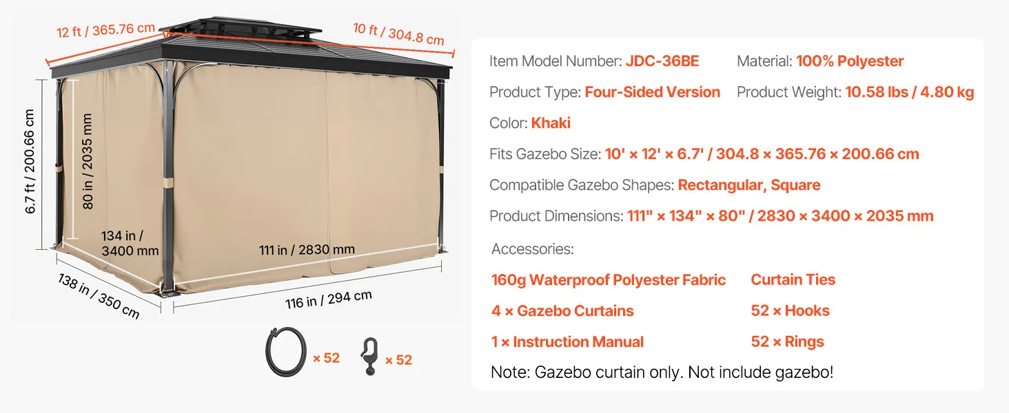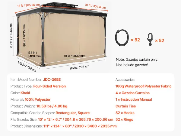 Compatible Size: This 111" x 134" x 80" gazebo privacy replacement curtain is compatible with gazebo with post-to-post spacing of 138 (L) x 116 (W) in / 350 x 294 cm, made from 100% polyester for outstanding durability and sun protection. The double-sided zipper allows for easy adjustments from both inside and outside, making installation quick and creating a comfortable, private outdoor space. It is recommended to measure the dimensions of the gazebo and hanging curtain space before purchase.