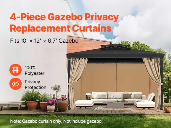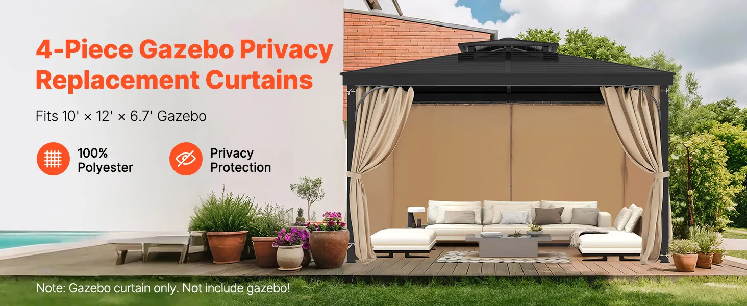 VEVOR Gazebo Curtains Outdoor, Fit Most 12' x 10' x 6.7' Gazebos, 4-Panel Sidewall Gazebo Privacy Curtains with Zippers, Outdoor Curtain Replacement for Patio Canopy, Only Curtain, Khaki