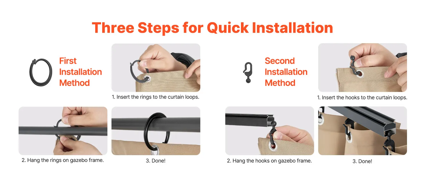 Dual-Sided Zipper Design: The gazebo replacement curtains features dual-sided zipper that enables effortless opening and closing from both sides, offering great convenience for easy access in and out of the gazebo.