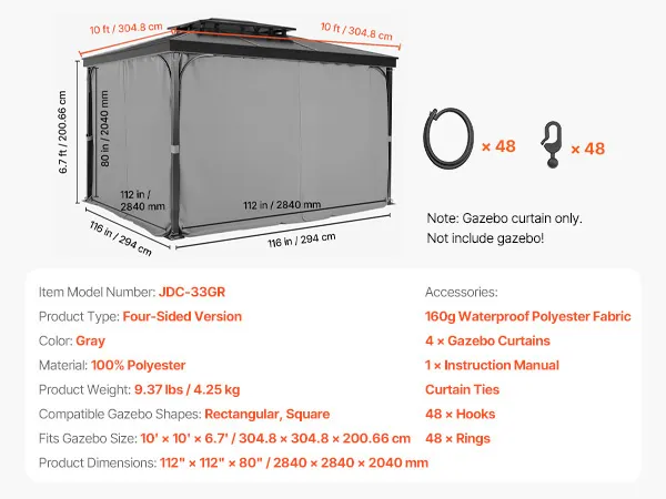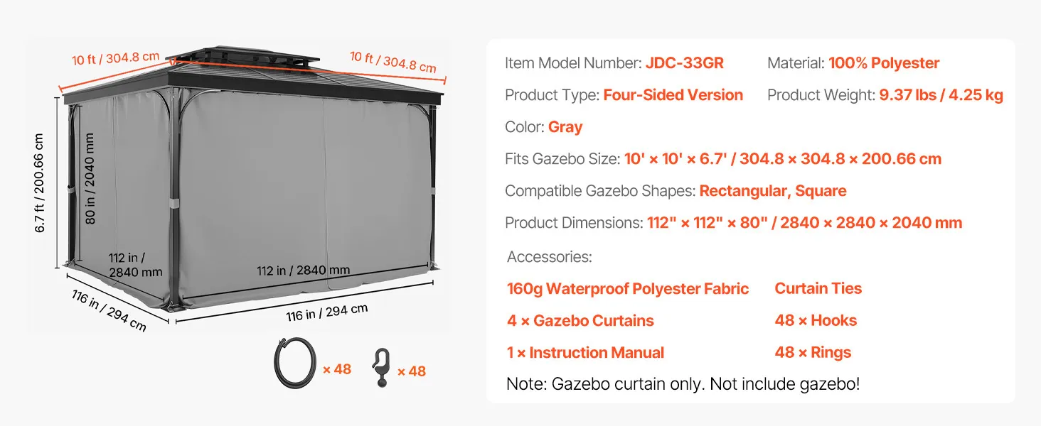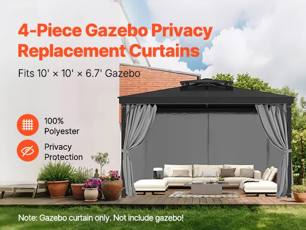 Compatible Size: This 112" x 112" x 80" gazebo replacement curtain is compatible with gazebo with post-to-post spacing of 116 (L) x 116 (W) in / 294 x 294 cm., crafted from 100% polyester for exceptional durability and sun protection. The double-sided zipper allows easy adjustments from inside and outside, making installation quick and ensuring a private, comfortable outdoor space. It is recommended to measure the dimensions of the gazebo and hanging curtain space before purchase.