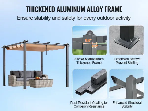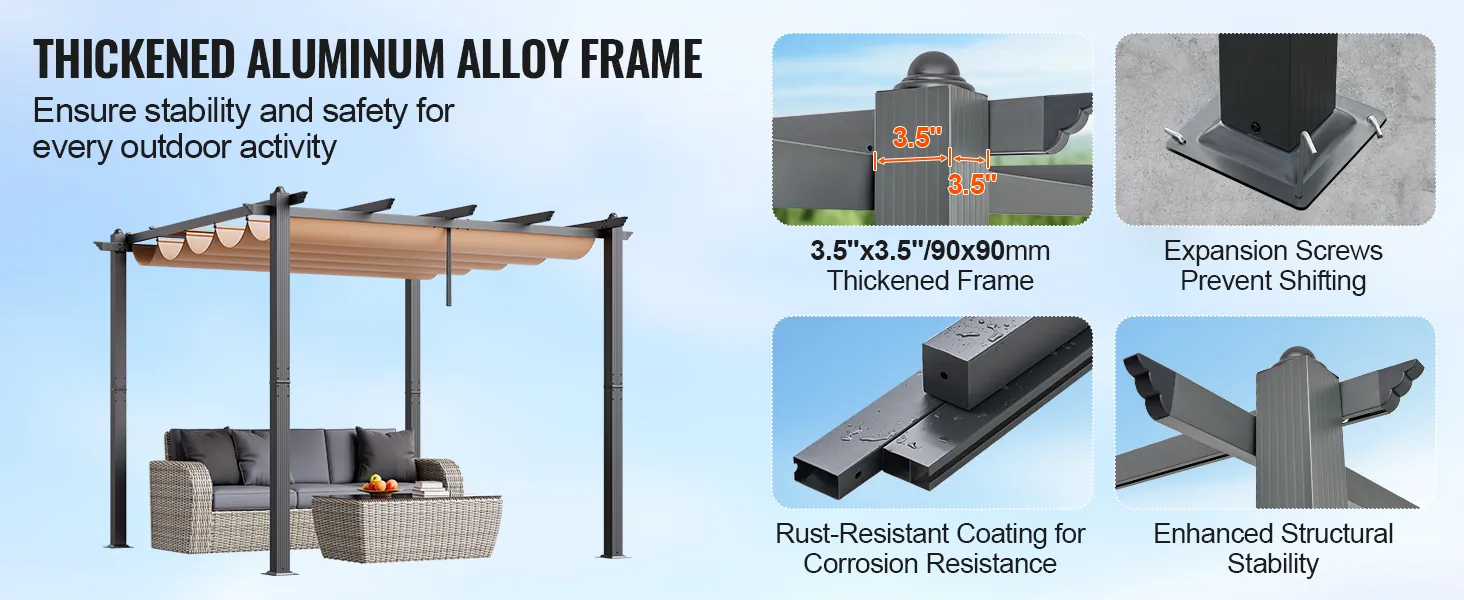 Sturdy and Durable: Our retractable pergola features a heavy-duty aluminum alloy frame and thickened posts (3.5"x3.5" / 90x90mm), ensuring stability. The frame is coated with a rust-resistant layer to enhance corrosion resistance, while the top crossbeams and The ground nails provide additional stability, keeping the pergola secure and reliable even in strong winds.