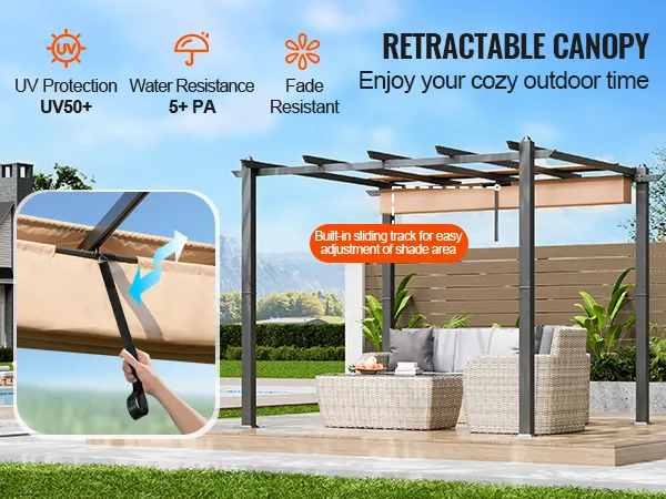 Adjustable Shade Canopy: Our pergola is equipped with an adjustable retractable canopy, featuring a built-in sliding track design. You can easily adjust the shade area to enjoy the perfect balance of sun and shade. Whether you need shade on hot summer days or protection from light rain, it provides an optimal comfort experience.