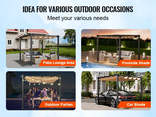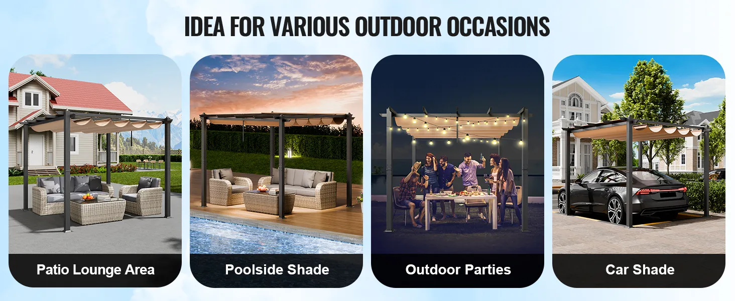 The pergola is suitable for various occasions, including patios, poolside, outdoor parties, and car shading. It meets a range of outdoor needs, providing a comfortable and cool space for family relaxation, gatherings, or vehicle protection, enhancing overall outdoor living quality.