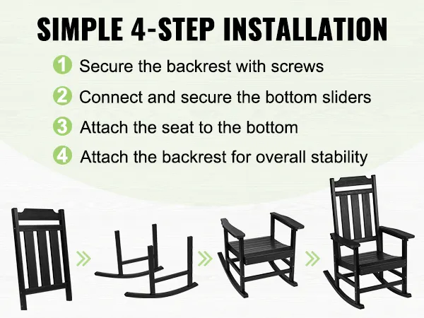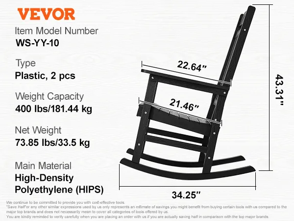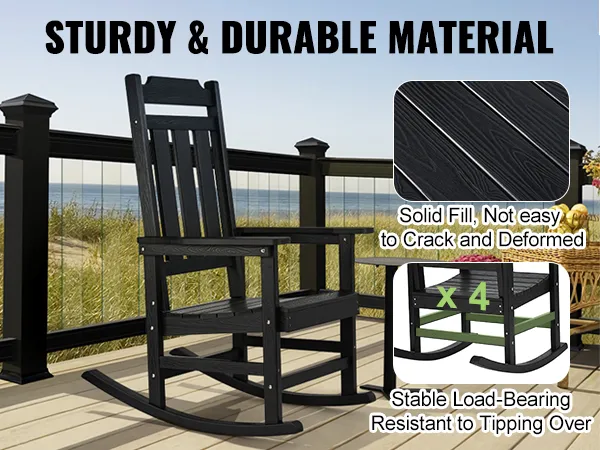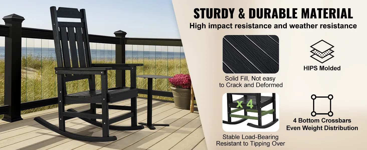 Stevig en duurzaam materiaal: deze veranda-schommelstoel is gemaakt van polystyreen met hoge dichtheid (HIPS), wat een solide constructie biedt met verbeterde schokbestendigheid en stabiliteit. Het ondersteunt maximaal 181,44 kg en is geschikt voor verschillende lichaamstypes. Het materiaal is bestand tegen vervorming, vervaging en verwering, waardoor een lange levensduur wordt gegarandeerd.