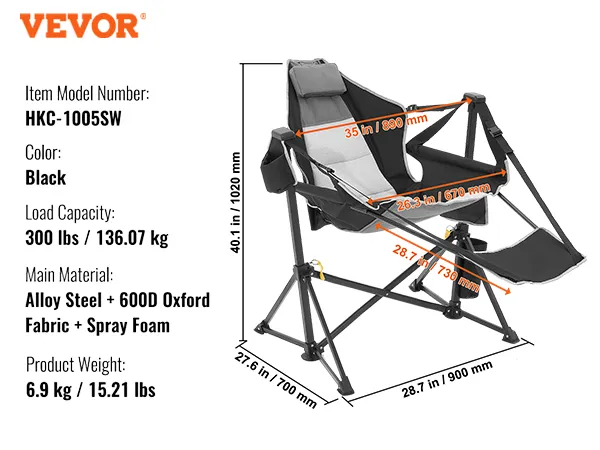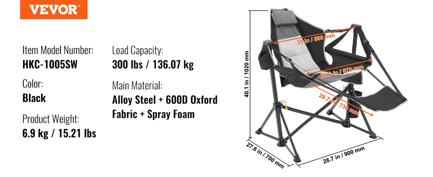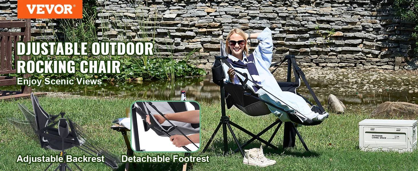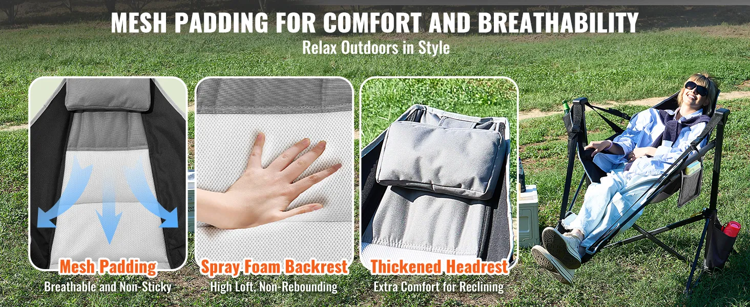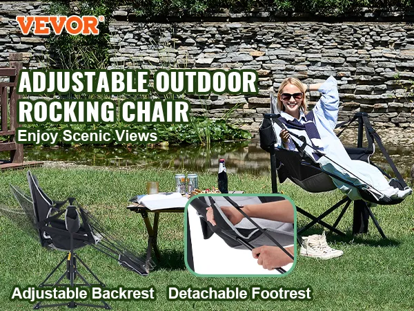 VEVOR Liggende Kampeerstoel, Draagvermogen Kampeerhangmatstoel met 136 kg, Opvouwbare Swing Lounge Stoel met Voetensteun, Opbergtas, Hoofdsteun en Verstelbare Rugleuning, voor Kamperen en Andere Buitenactiviteiten
