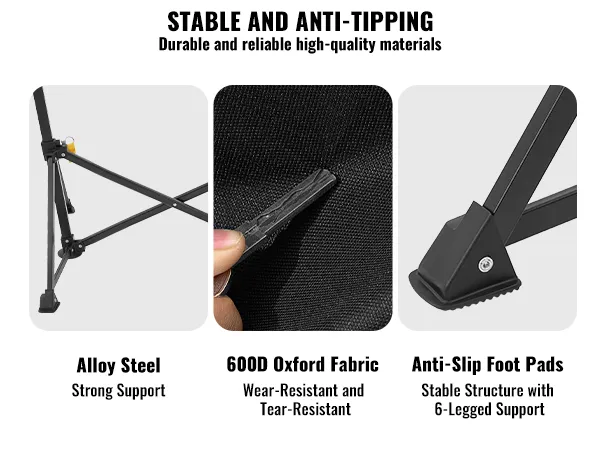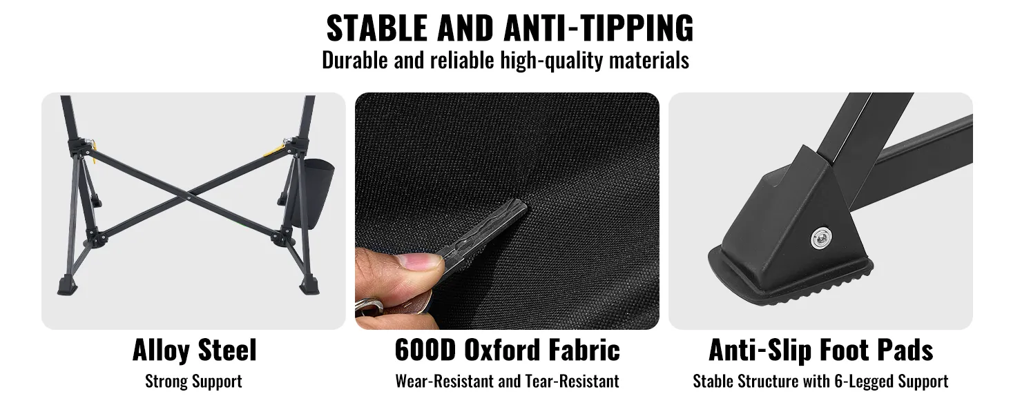 Met een sterk gelegeerd stalen frame en duurzame 600D Oxford-stof ondersteunt deze verstelbare campingstoel tot 136 kg. De antislipvoetkussens en het ontwerp met zes poten zorgen voor stabiliteit, zodat u met vertrouwen kunt ontspannen.