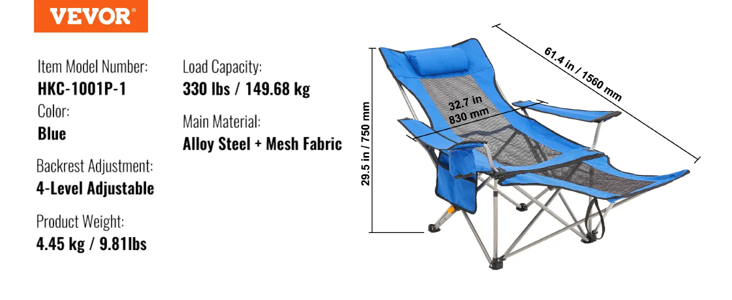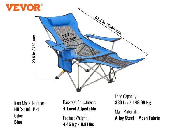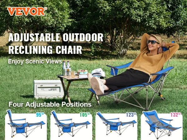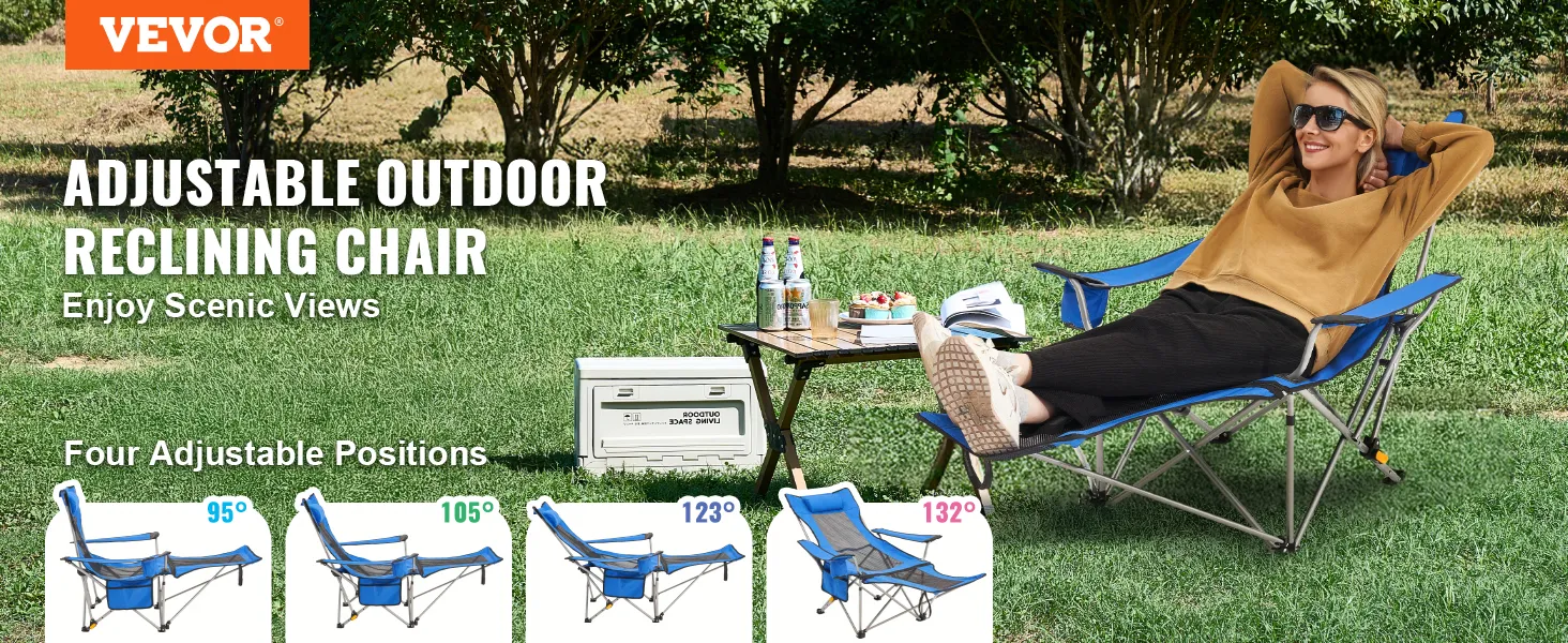 VEVOR Campingstoel, Campingligstoel 150 kg, Tuinstoel met 4 laadposities, met voetensteun, bekerhouder, zijvak en hoofdsteun, voor kamperen, vissen en buitenactiviteiten, Blauw