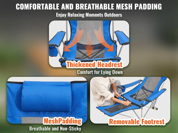 Comfortabele ervaring: de duurzame mesh-voering van onze draagbare stoel wordt gecombineerd met een afneembaar kussen voor zacht comfort. De gewatteerde hoofdsteun ondersteunt uw hoofd en past zich aan de ronding van uw nek aan, terwijl u dankzij de voetsteun heerlijk kunt ontspannen in een liggende positie. De voetsteun is indien nodig ook afneembaar.