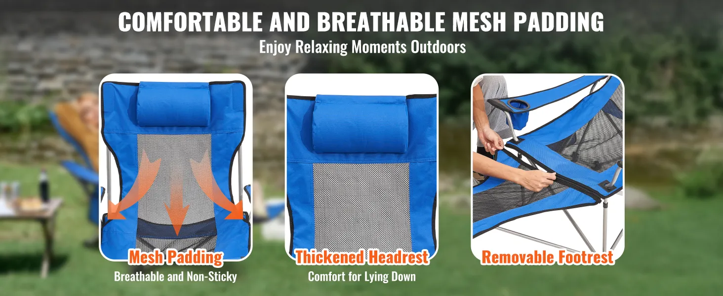 Onze outdoor loungestoel is gemaakt van luxe mesh-stof en heeft een afneembare voetsteun. De dikke hoofdsteun biedt extra ondersteuning en dankzij de afneembare voetsteun kunt u uw comfort aanpassen voor een huiselijke kampeerervaring.