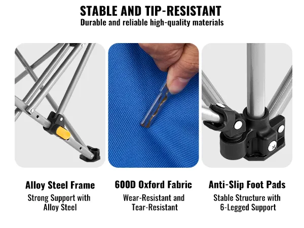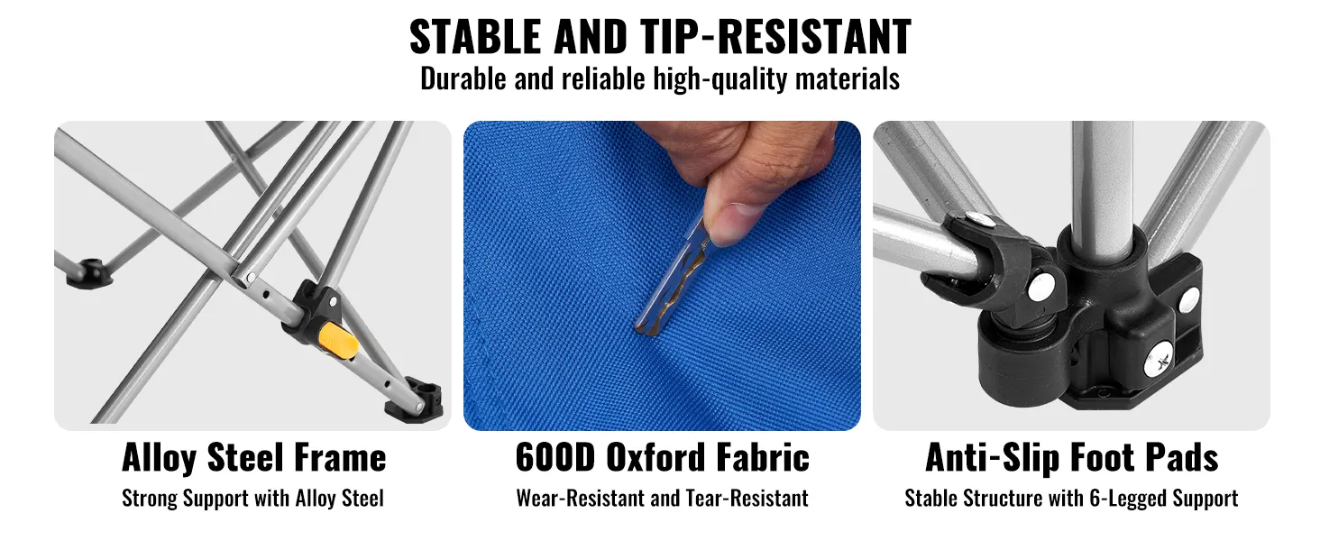 Deze stevige en ondersteunende campingstoel is gemaakt van hoogwaardig gelegeerd staal en 600D Oxford-stof. Antislipvoetkussens en een ontwerp met zes poten zorgen voor stabiliteit bij gebruik buitenshuis.