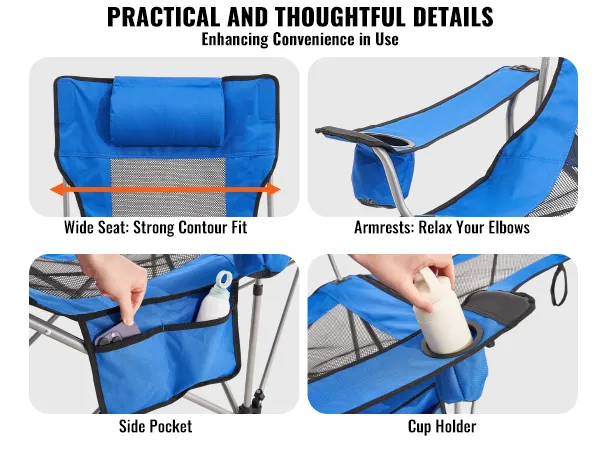 Met een brede zitting voor extra comfort, ontspannende armleuningen en handige zijvakken met bekerhouders, kunt u met deze draagbare stoel genieten van zorgeloze buitenactiviteiten zoals lezen en drinken.