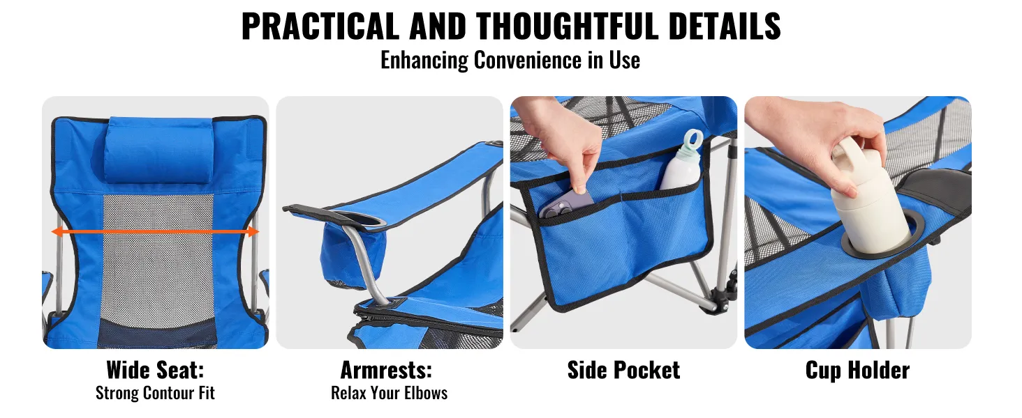 Comfortabel ontwerp: deze verstelbare campingstoel heeft een verlengde zitting voor meer stabiliteit. De vier verstelbare hoogte-instellingen zorgen voor een betere rugsteun, zodat u een comfortabele houding kunt vinden om te lezen, een dutje te doen of van het uitzicht te genieten.