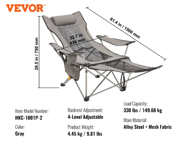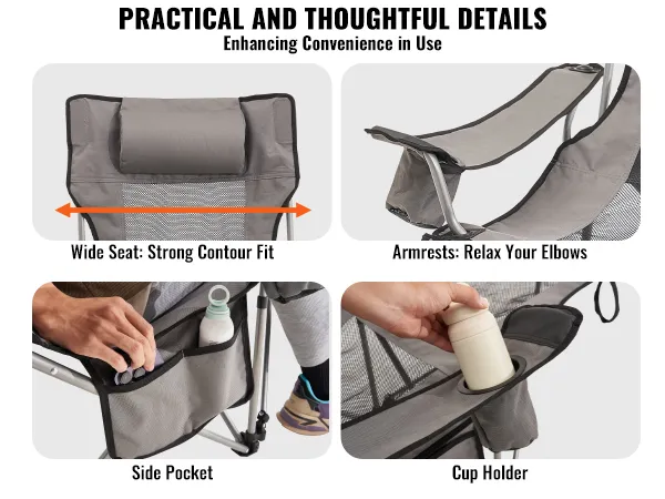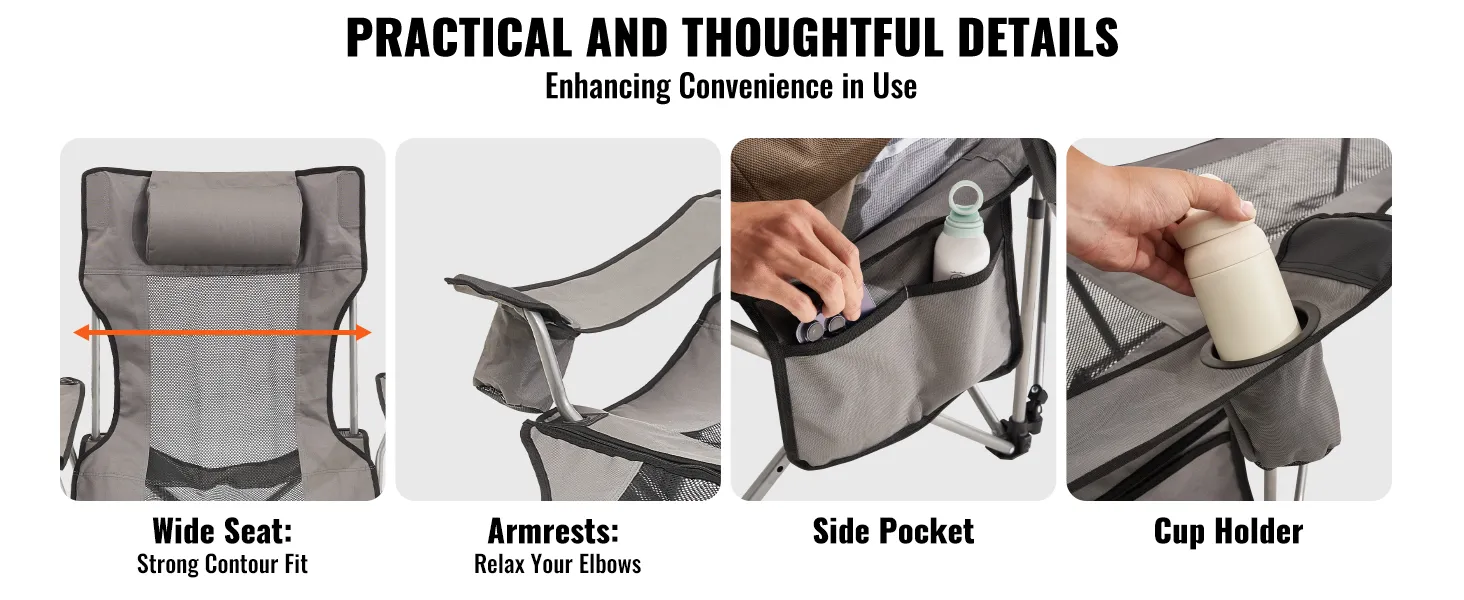 VEVOR Campingstoel, opvouwbare campingstoel met een maximale belasting van 150 kg, met voetensteun, bekerhouder, zijvak en hoofdsteun, voor kamperen, vissen en buitenactiviteiten, grijs